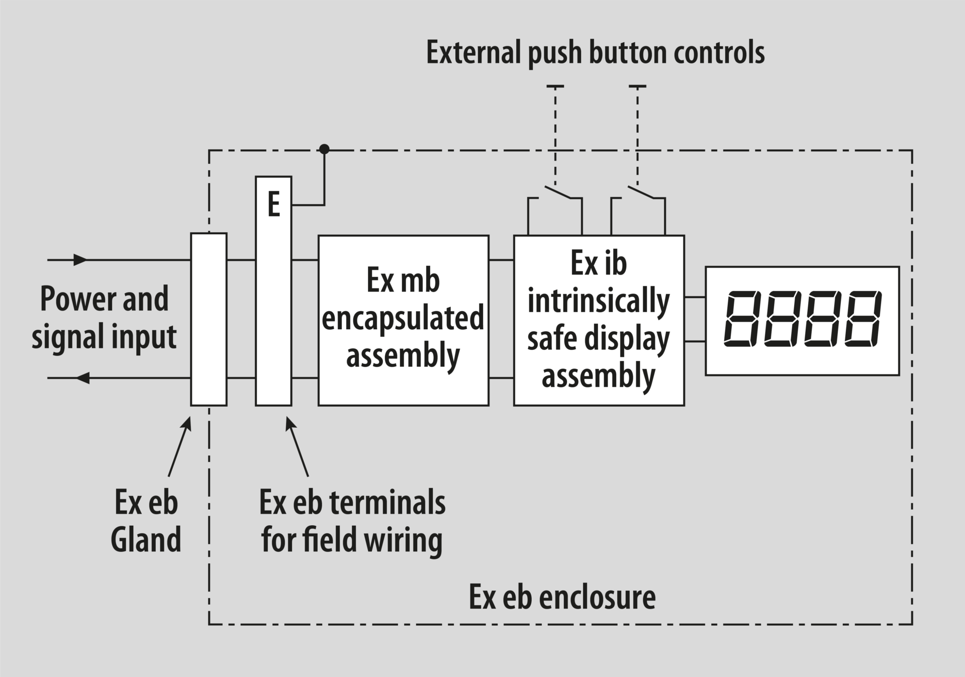 This alternative design, which uses multiple well established existing explosion protection techniques, is applicable to a wide range of display instrumentation for installation in Zone 1 and Zone 2. It is less expensive than a traditional flameproof Ex d instrument, it allows a much larger display to be incorporated and has tactile push button controls which can be operated in the hazardous area. The alternative instrument only requires Ex eb glands for sealing field wiring entries and complies with flameproof Ex d installation requirements.