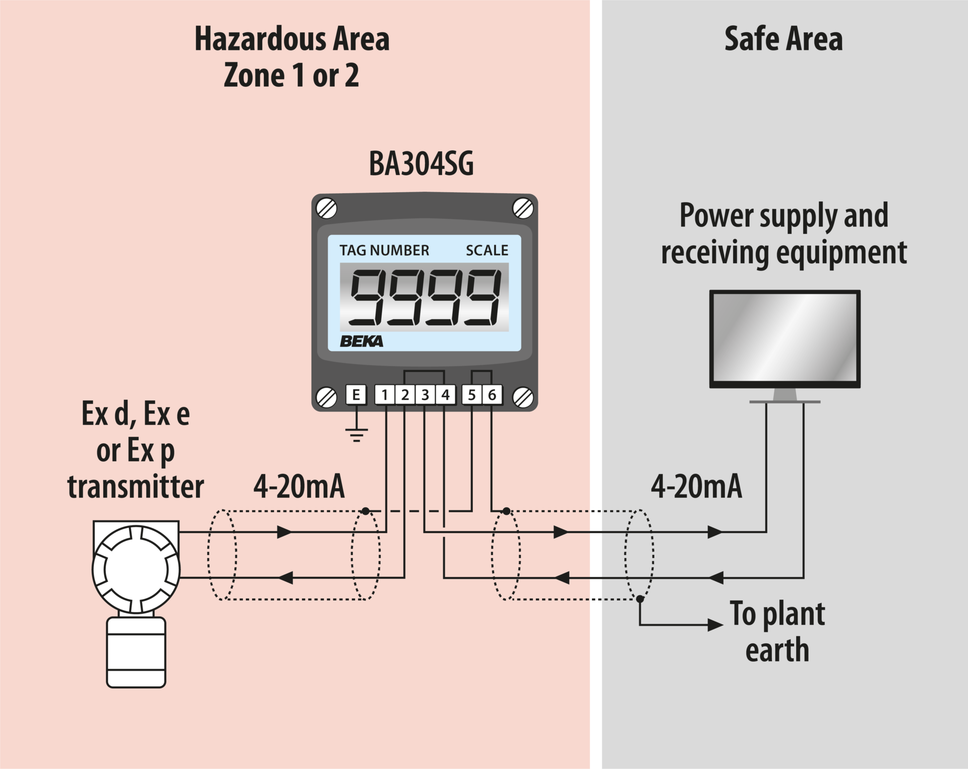 Diagram: BA304SG indicator displaying 4-20mA output from Ex d, Ex e or Ex p transmitter (click to enlarge)