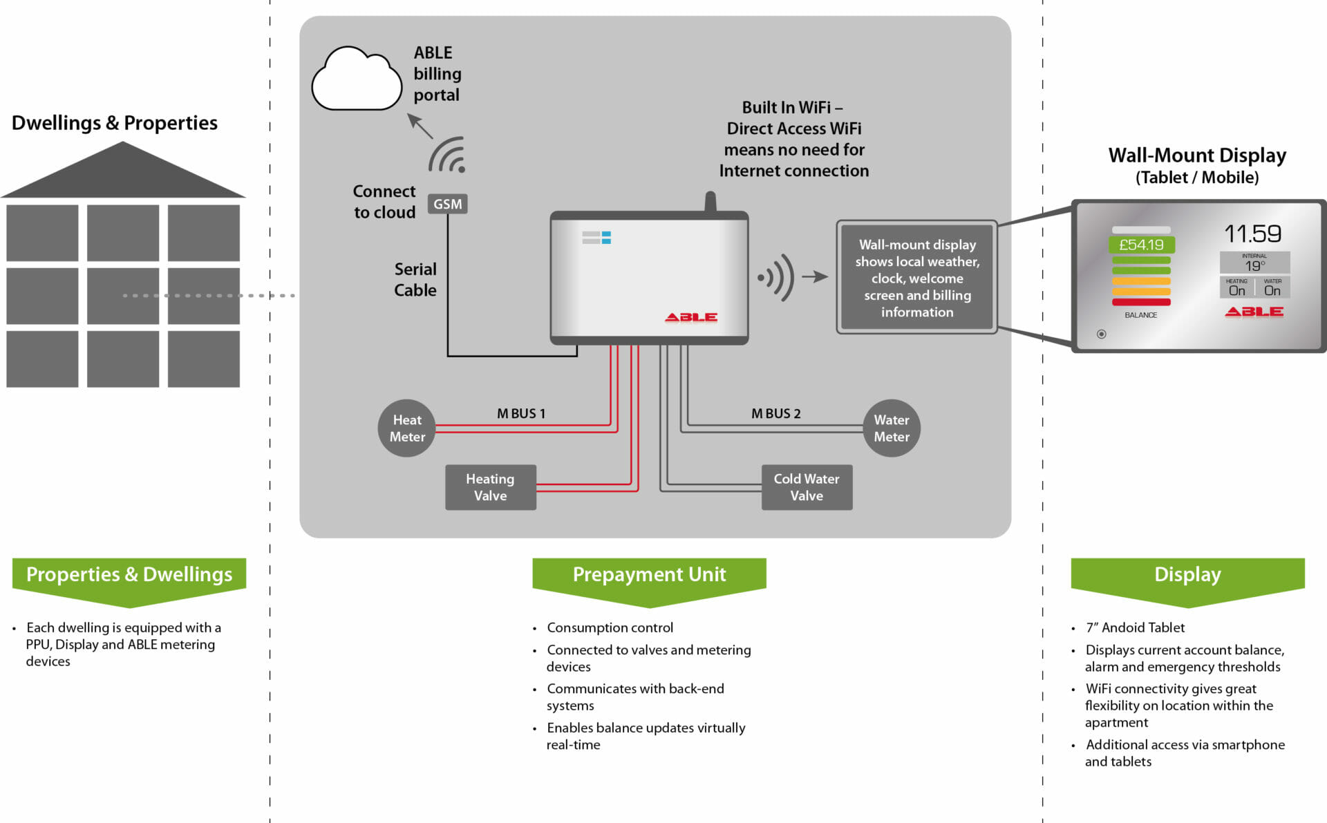 Able offer a range of flexible credit and prepayment billing solutions including consolidated bills for landlords, individual bills to tenants and an Able cash management service. Our ‘SmartPay’ billing solution includes a wireless display at tenants homes allowing them to view and pay their energy account balance via credit / debit card with the minimum of fuss. SmartPay can also be configured for full credit payment and there is no debt risk for landlords.