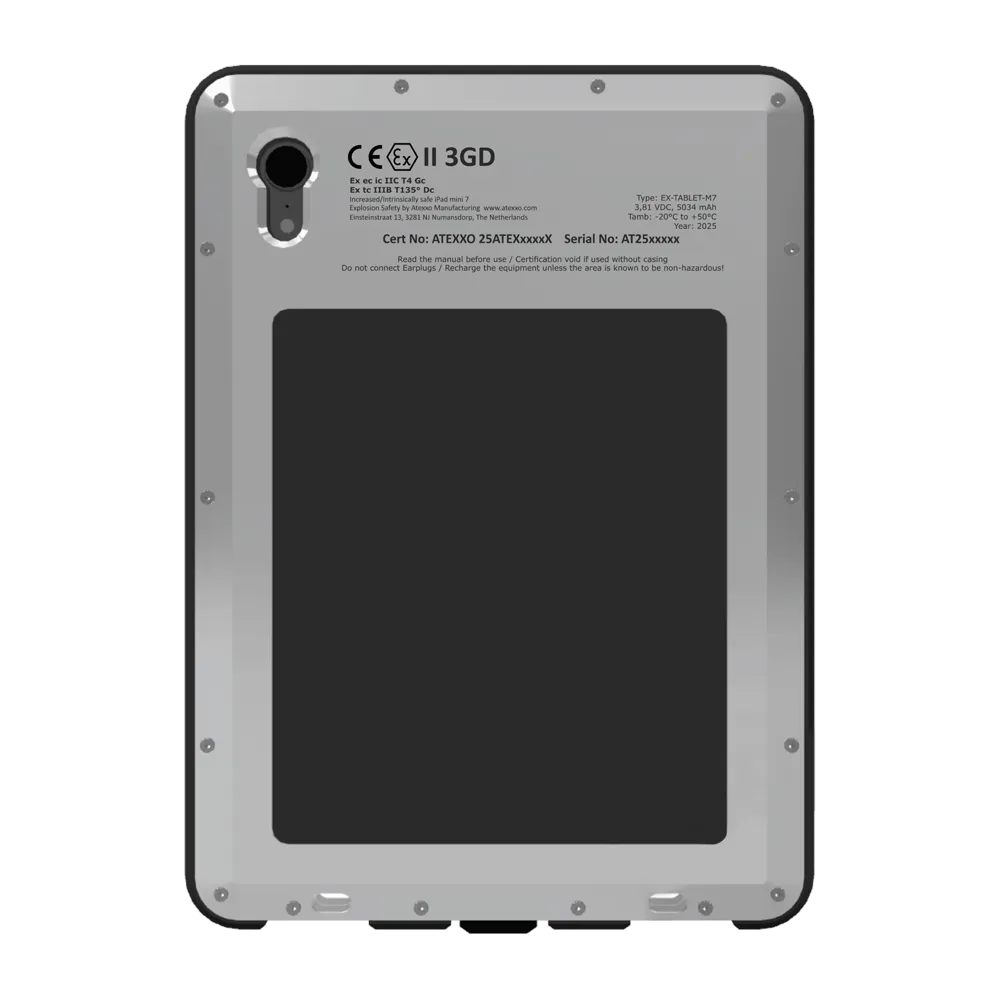 This device is engineered for professionals working in petrochemical plants, offshore environments, refineries, and other facilities with Zone 2 designated areas. Atexxo has modified the standard iPad Mini 7 to ensure safe operation in environments where flammable gases or vapours are present under abnormal conditions.