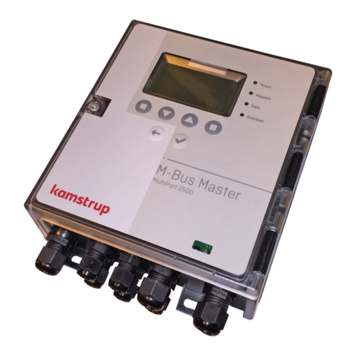 This is an M-Bus Master MultiPort 250D with display for 250 slaves with an integrated 100-240V 50/60Hz power supply. The 250D supports primary, secondary and enhanced secondary addressing and wild card search with collision detection. The M-Bus Master MultiPort 250D includes RS-232, RS-485, USB and optical eye communication ports as well as cascade functionality.