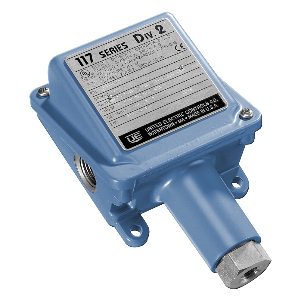 Able Instruments are United Electric’s Exclusive Representative for Sales and Service in the UK and Ireland, including the UE 117 Series. The United Electric 117 Series, available with optional ATEX/UKCA EX Intrinsically Safe certification, can be used to measure vacuum, pressure, differential pressure, or temperature in a variety of applications. The rugged, one-piece enclosure features a slanted cover for wiring accessibility to the enclosed terminal block that is wired to either a SPDT or DPDT hermetically sealed microswitch. All welded, stainless steel pressure connections and sensors provide superior corrosion resistance – NACE compliant – and fire-safe protection within the harshest environments.