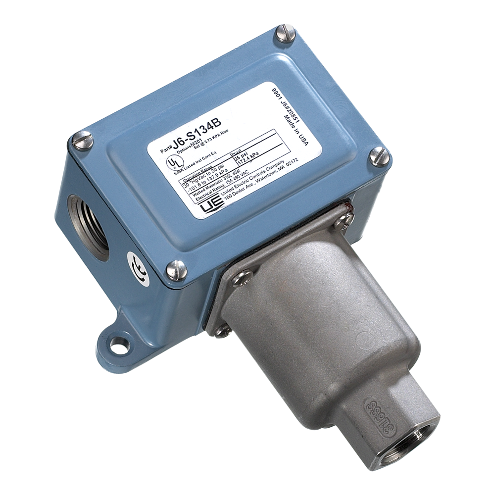Able Instruments are United Electric’s Exclusive Representative for Sales and Service in the UK and Ireland, including the UE J6 Series, a cost-effective pressure switch for general purpose use. Available with either 1/4″ NPTF or 1/8″ NPTM brass pressure connections. Single SPDT switch output, internal, NEMA 4X enclosure, isolated metal bellows sensors. UL listed, cUL certified, CE compliant. Its compact design and combination of set-point sensitivity and narrow or optional adjustable deadband, offers cost-saving solutions for a variety of applications. The J6 is ideally suited for a wide range of industrial processes such as alarm/shutdown and low/high service pressures. OEMs also utilise the J6 in machinery and equipment for threshold protection.