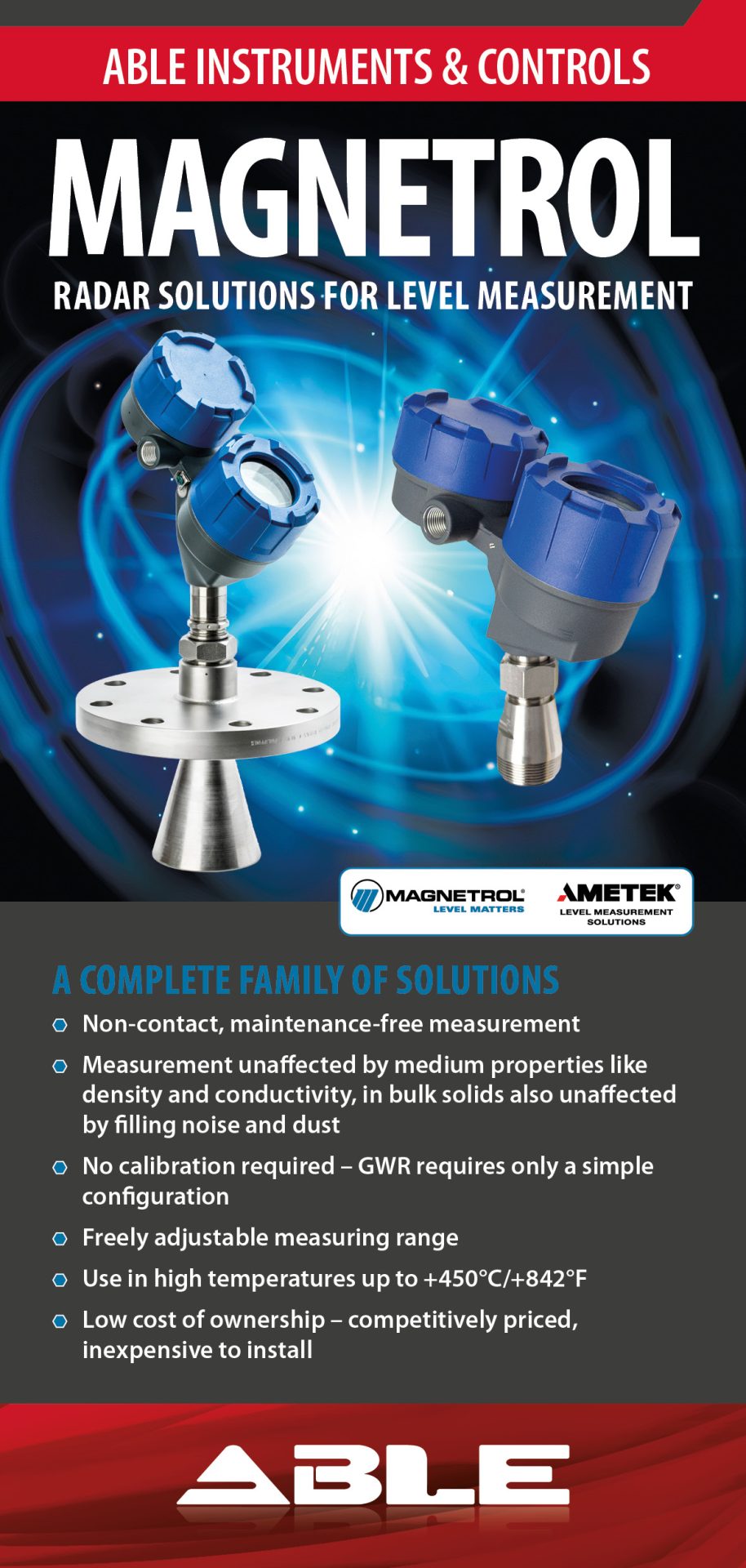 Able Instruments are the official UK representative for AMETEK Magnetrol, offering an extensive range of innovative level and intelligent flow controls for the process industries, monitoring chemicals, water, slurries, sewage, gas, liquids and solids.